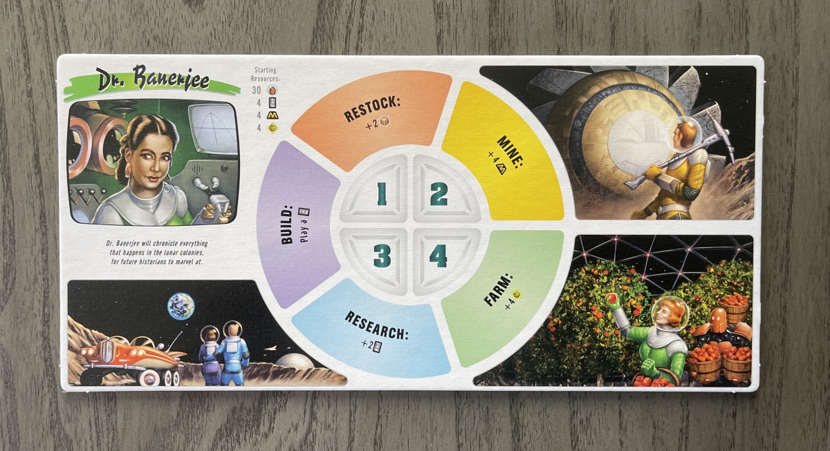 The artwork on the player boards and cards have an old-fashioned feel to them, which works thematically as the setting is an alternate history where mankind is putting colonies on the moon in what possibly is the 1950’s (the actual timeframe is non-specific).