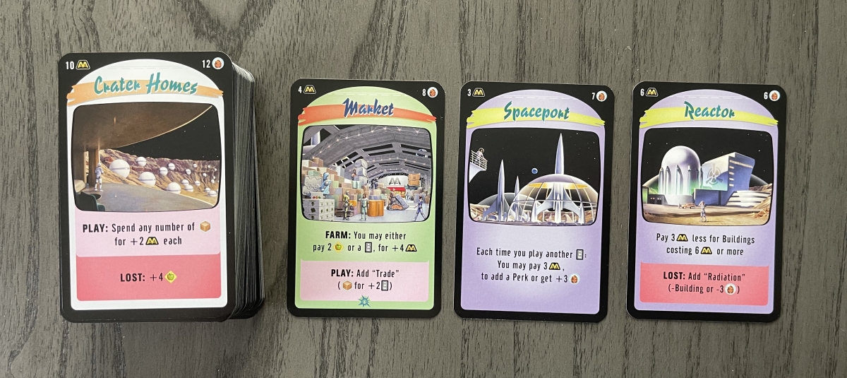 In fact, Moon Colony Bloodbath is both easy to teach and to play. Most of the instructions are printed right on the cards, so once you know the basic progression of the game, all you have to do is turn over the next card, follow its instructions, rinse and repeat. Which means you can focus on your meaningful choices when it comes to building your engine and managing your resources.