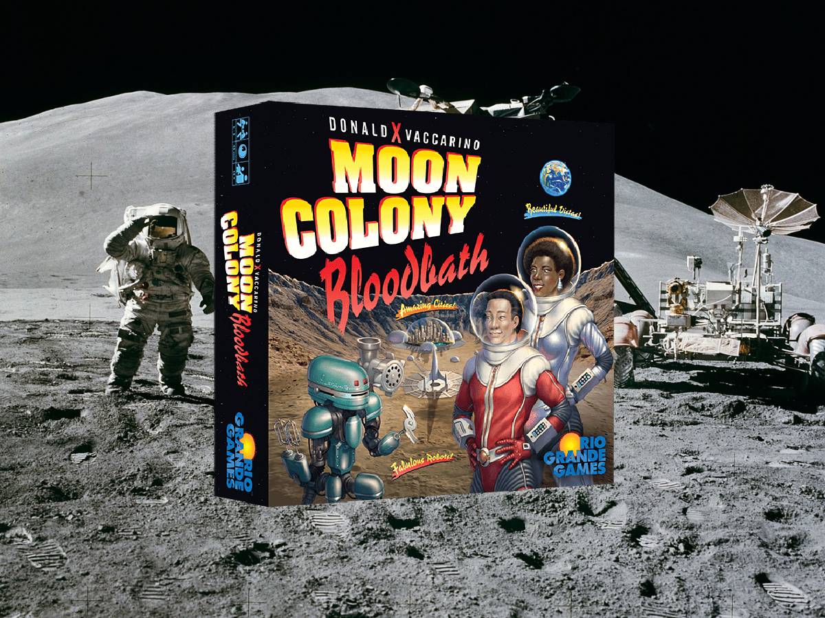 Moon Colony Bloodbath was designed by Donald X. Vaccarino and published by Rio Grande Games, with illustrations by Franz Vohwinkel.