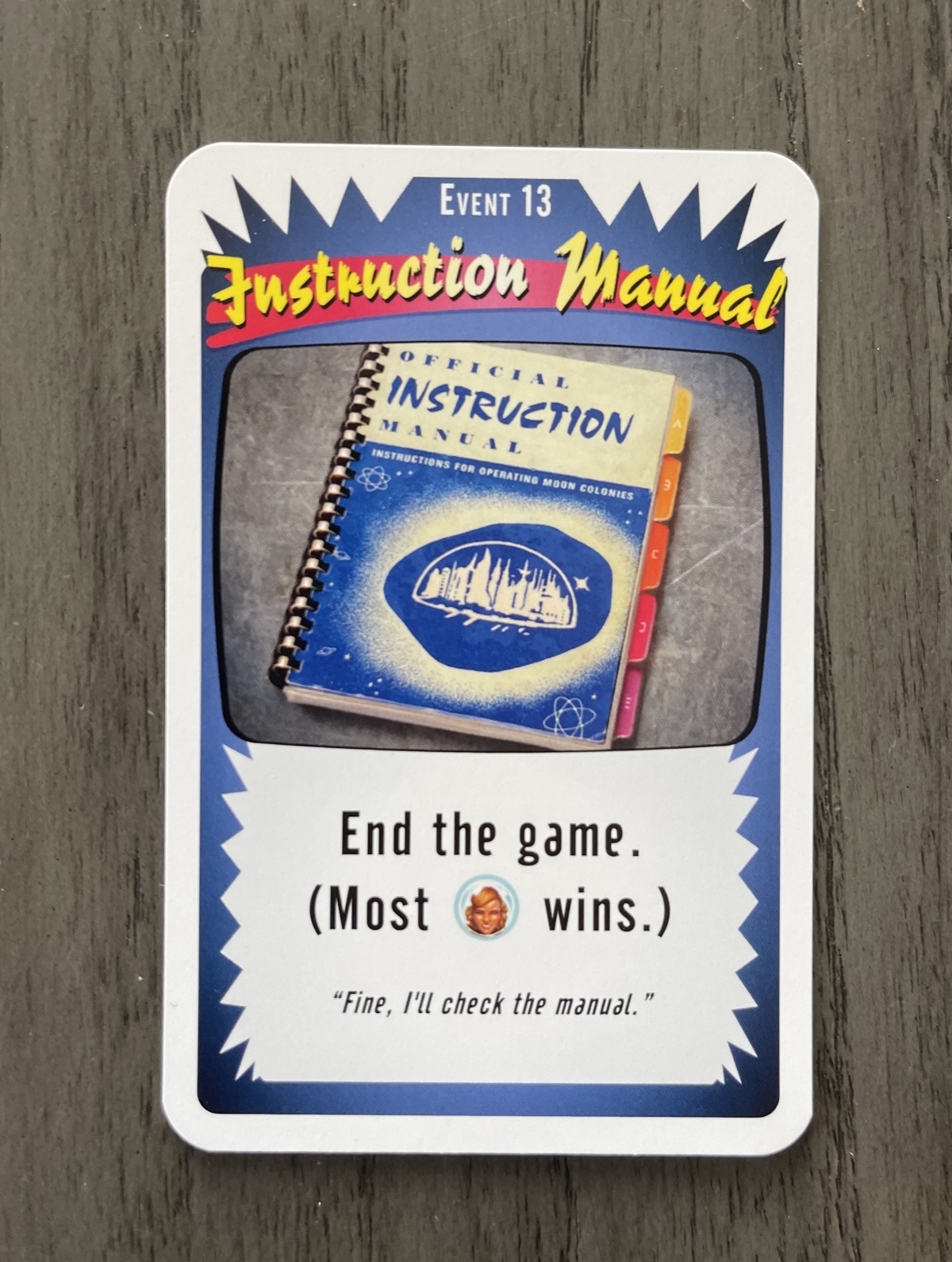 Some people may think that the artwork is a bit bland and old-fashioned, but it certainly fits that retro futuristic theme. It would be a shame to pass the game up based off of the art, because there’s a very enjoyable tableau building game in Moon Colony Bloodbath. It may come as no surprise to those playing the game that Donald X. Vaccarino was the designer of one of the greatest deckbuilding games of all time, Dominion. Moon Colony Bloodbath’s gameplay is simple yet engaging, and individual games are quick enough that you’ll often want to reset and try another, in the hopes of getting just a little bit farther into the Event deck…and maybe even to that “Instruction Manual” card.
