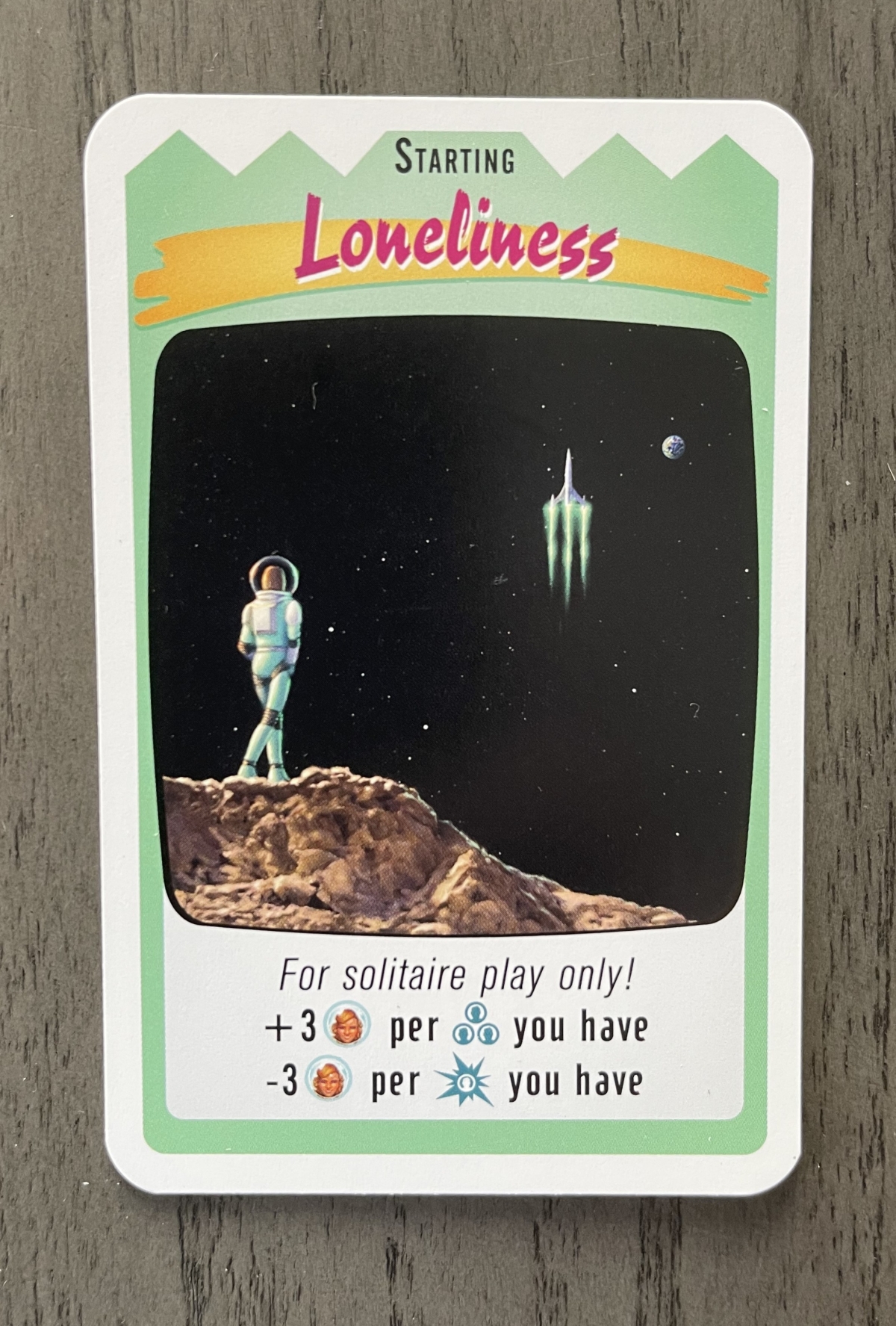 Solo play couldn’t be easier. During setup, simply add the Loneliness card to the Progress Deck at the start of the game. That’s it! Otherwise play is identical to a multiplayer game.