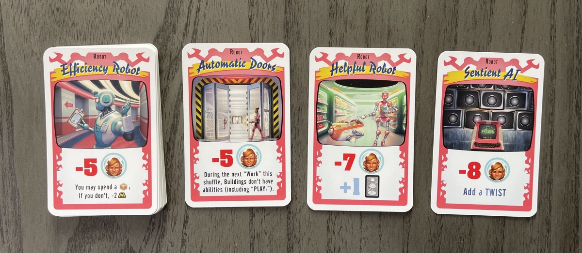 Robots are added to the progress deck via the Glitch Event card. Additional Twists might get added during a game, but only if you’ve already added the Sentient AI Robot.