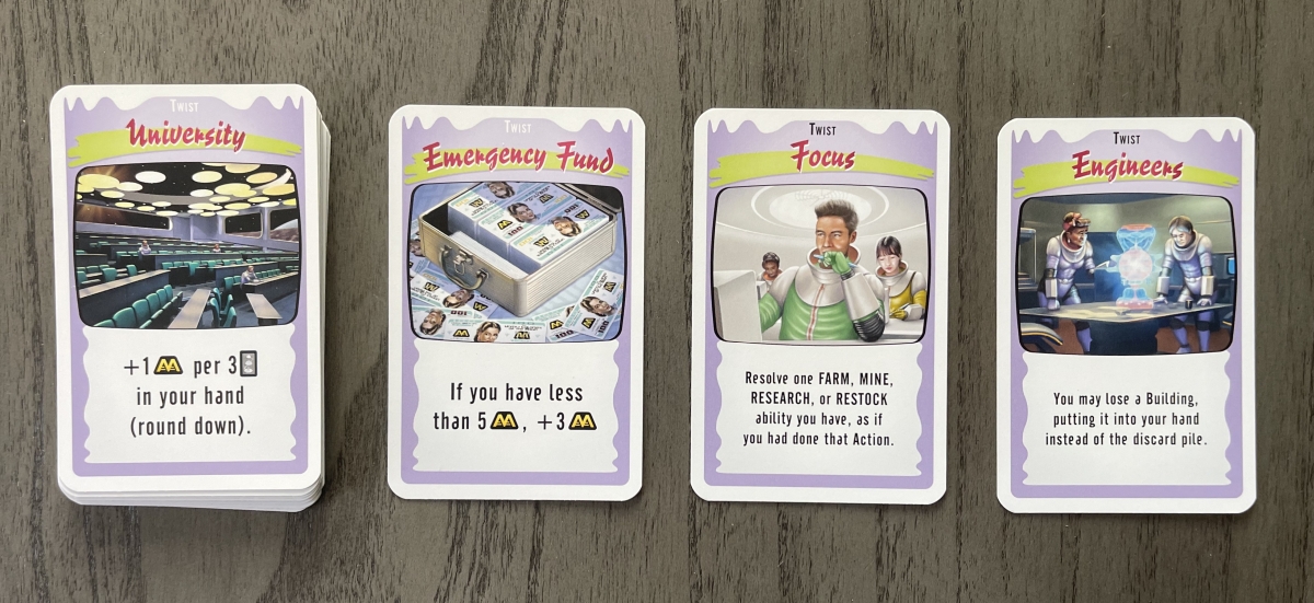 Shuffle the Twists and deal out 2 face up for all players to see and familiarize themselves with. Then shuffle them into the Starting cards (2 copies of Trouble and 4 copies of Work). This will be the initial Progress Deck.