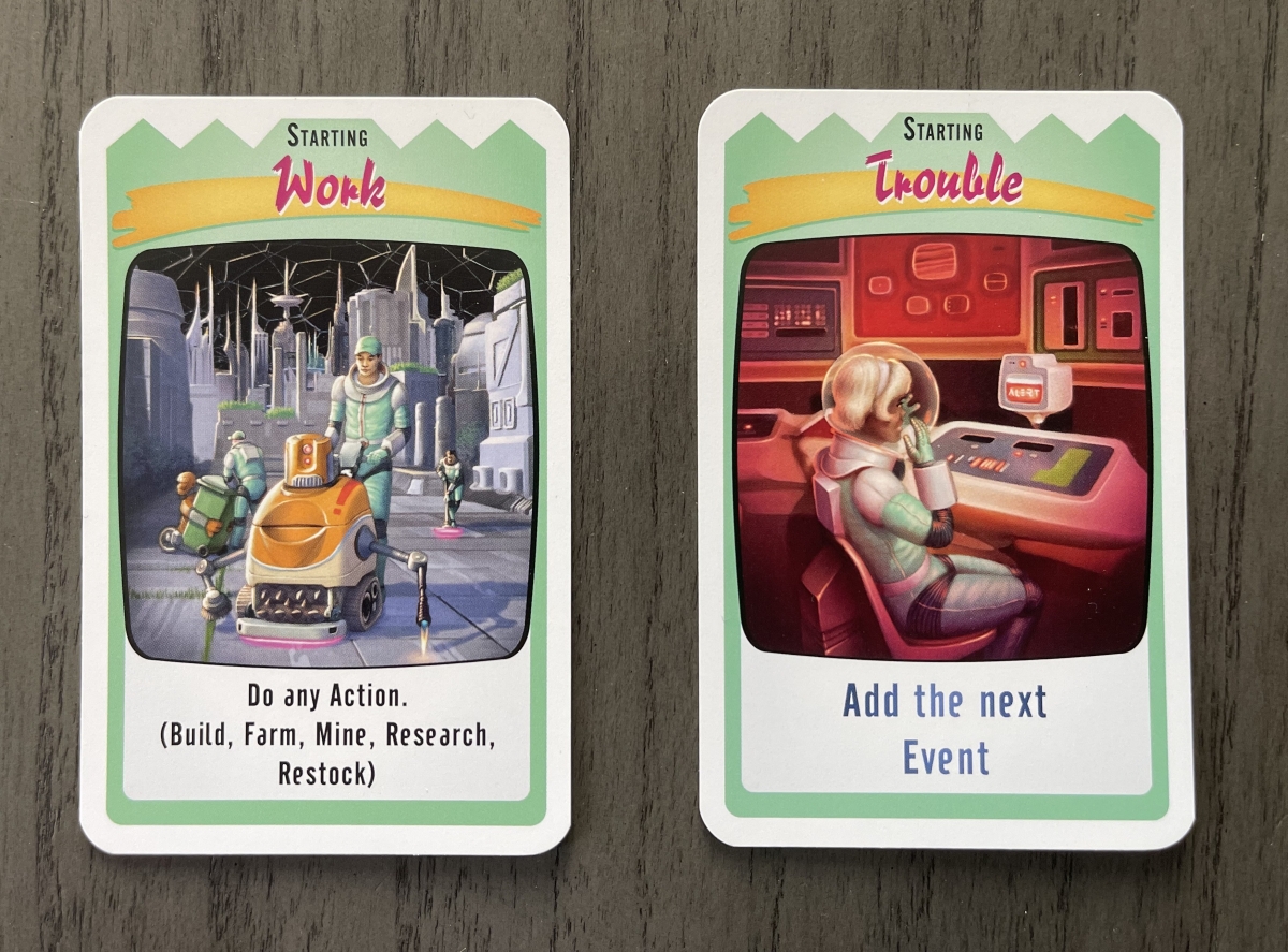 The designer, Donald X. Vaccarino, calls Moon Colony Bloodbath “an engine-building engine-losing tableau game.” As opposed to most engine-building games, in this one you will inevitably see your engine disappear, piece by piece, as your moon colony falls prey to accidents, starvation, and malfunctioning robots. It’s one of the things that gives the game a unique twist on a familiar mechanic.
