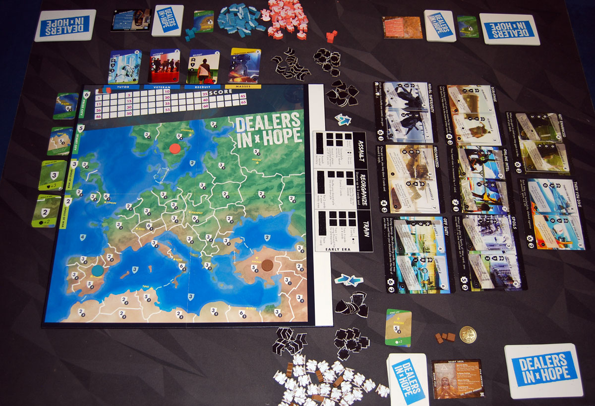 I don’t typically play a lot of war games, even though many games I’ve played may have some element of combat or area control. Many folks in my gaming group are competitive but not confrontational, so the idea of direct assault can be a little off-putting for them. On the other hand, I really love deck-building games and I love seeing how people use that in unique ways. So I was curious about Dealers in Hope, which incorporates elements of both (as well as some worker placement).