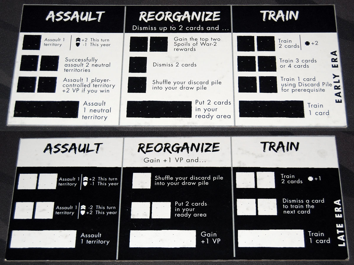 There are three types of actions: assault to take over territories, reorganize to set up your deck, and train to gain new cards. Each of the specific action spaces also has some special effects or abilities. The small spaces can only take one action cube, and the wide spaces can take any number of action cubes. Each player also has one large leader action cube—this can be used once per era, and can be used on a space that is already occupied.