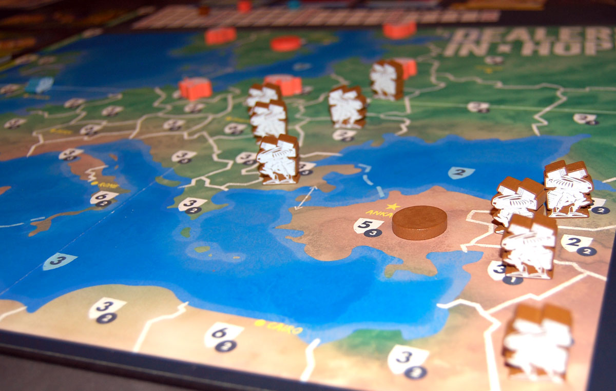 Combat itself is a pretty simple numbers game without too much back-and-forth. The attacker has to overcome the inherent defense; the defender has one chance to add more defense, and then the attacker has one chance to respond. Although the meeples look like battle units, they’re really control markers—you just have one on each of your territories, and you don’t amass a big army of them on a border and swarm into a space. Instead, the strength of your attack or defense is entirely based on the cards you play.
