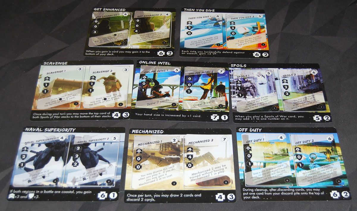 There isn’t always the same number of Level 1 and Level 2 cards from one set to the next—in the photo above, you can see the small numbers at the lower right of each card shows how many are in the decks, and there are 12 total Mechanized cards but only 10 total Spoils cards. Usually the artwork on the two card decks matches the background shown on the Master, though sometimes with a little bit of sizing or cropping differences so the individual cards still look good.