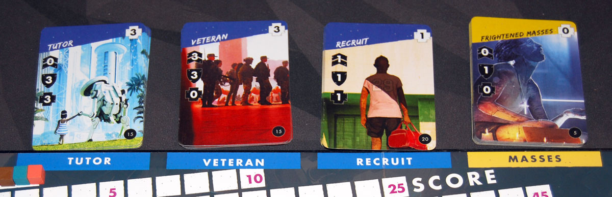 There are also basic cards that can be trained: there are a few types of Masses cards (which are free) but each one only provides 1 resource. Recruits provide 1 of anything, Veterans provide 3 attack or defense, and Tutors provide 3 Defense or Support.