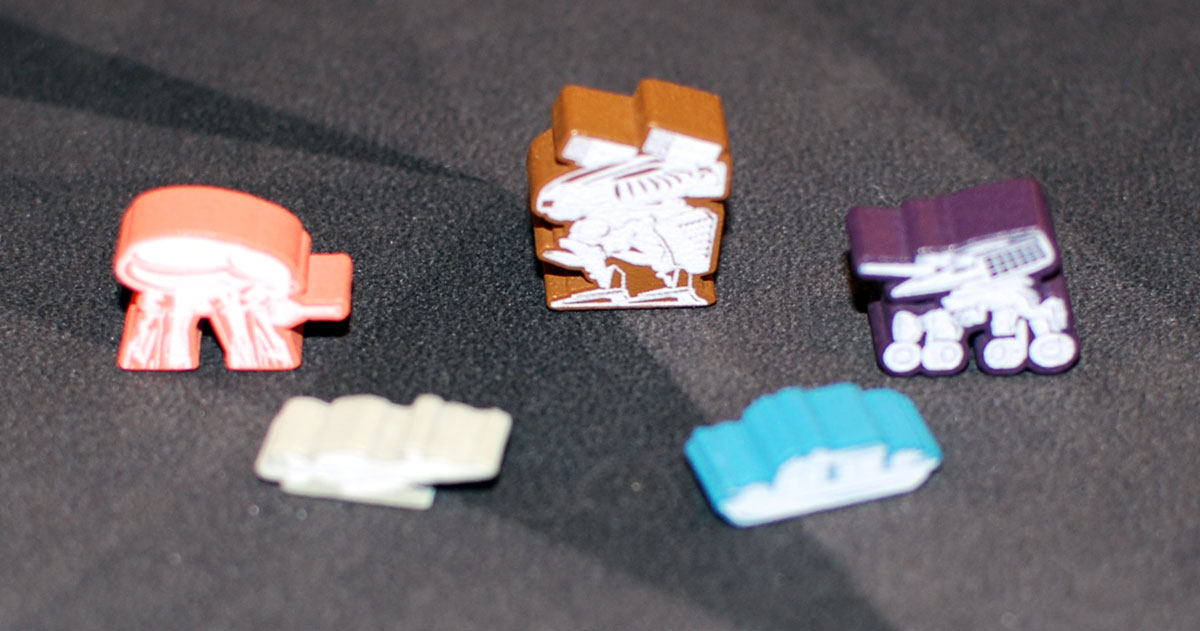 Each faction has its own unique meeple, which is nice both for thematic flavor and for ease of distinguishing between them, but it is interesting how much they vary in size. The brown meeples are the largest, two-legged mechs with rocket launchers, and the green ones, which appear to be fighter jets, are tiny in comparison. The blue faction has boats, which does seem a little funny when they start spreading across land, but I suppose there’s water everywhere at this point. All of the meeples are custom shaped with white screen-printing.