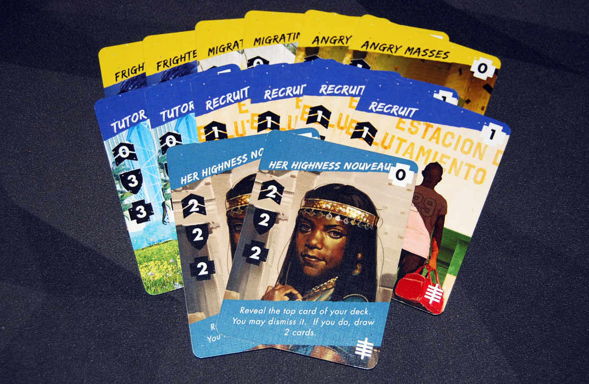 I like the variety in the different leaders and how they work. They have different special abilities (shown on the leader mat), leader card effects, and scoring conditions that will drive you toward certain strategies. Signor Mikhail Barakat is able to take extra Masses cards to take control of neutral territories—it lets him spread out quickly but at the risk of diluting his deck with weak cards. By contrast, Queen Nouveau’s card ability lets her dismiss cards to draw more cards; weeding your deck is important, but in this game you could find yourself running out of cards before the year ends. I do think it might be helpful to have some tips and hints for each leader, though, because some players had a hard time knowing how to make the most of their factions.