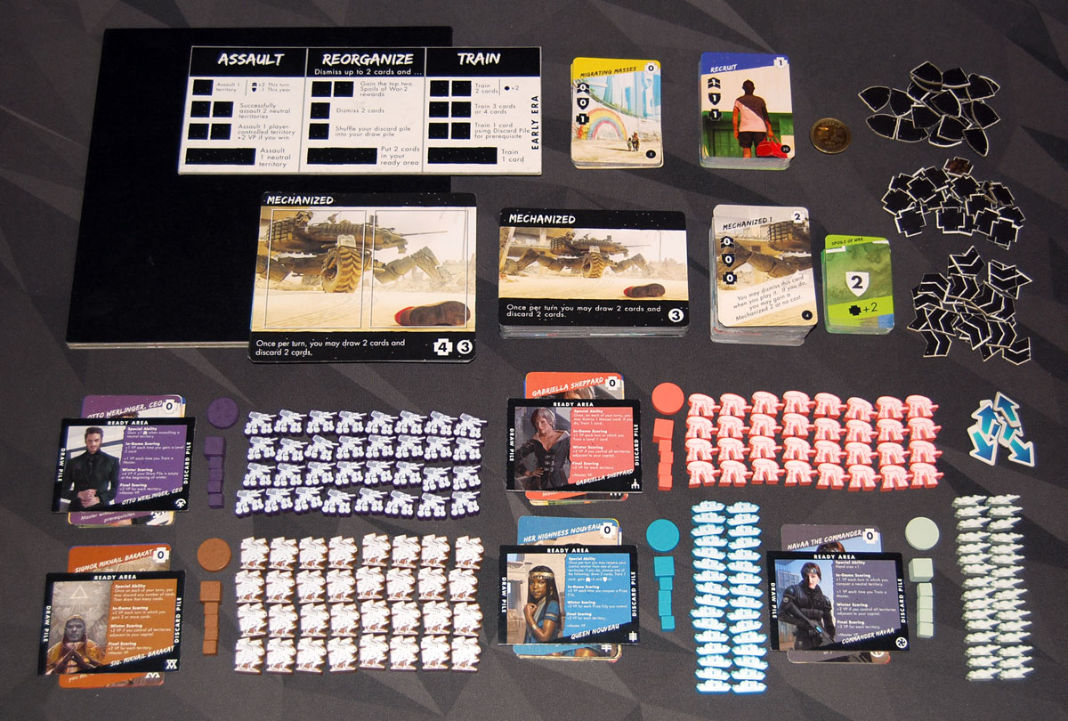 The actions are driven by a worker placement mechanic: you choose actions from a board, and since spaces are limited, it can be important to know what your opponents may want to do. Each of the action sections has one space that is unlimited, but it tends to be the most vanilla action in that section. If you want to make an assault with extra attack power, or train more than one card, or reshuffle your discard pile early, then you have to beat other players to those spaces (or use your special leader action cube). I like the difference between the early and late eras, too: it gives the game a nice arc with a build-up period early on, and moving toward using your deck in the second half.