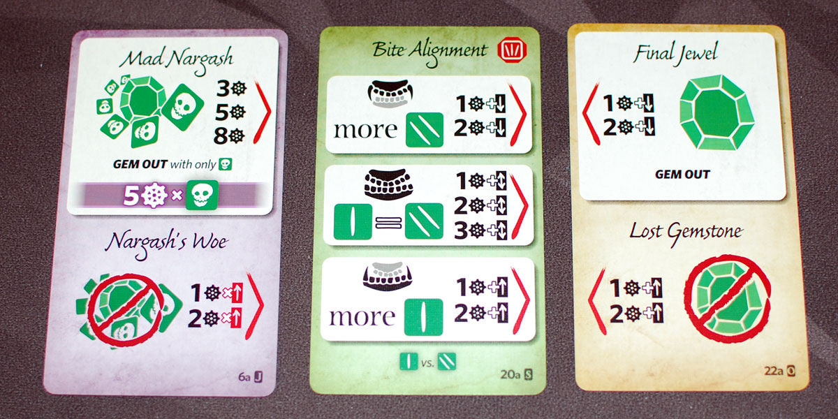 But in addition to climbing this ladder on the board, I like that there are optional jackpots that the Tumbler can go for. If you’ve got a lot of dice and you roll a lot of low numbers, you could go for the Grim Grin, getting 3 gears per die for just teeth (which usually pay out only 1 or 2 each). Another crowd favorite has been Mad Nargash, if you can Gem Out with only skulls placed—you earn 5 gears per die placed, and in this case it doesn’t matter if you run out of dice or not, so it allows some flexibility in how far you want to keep pushing your luck.
