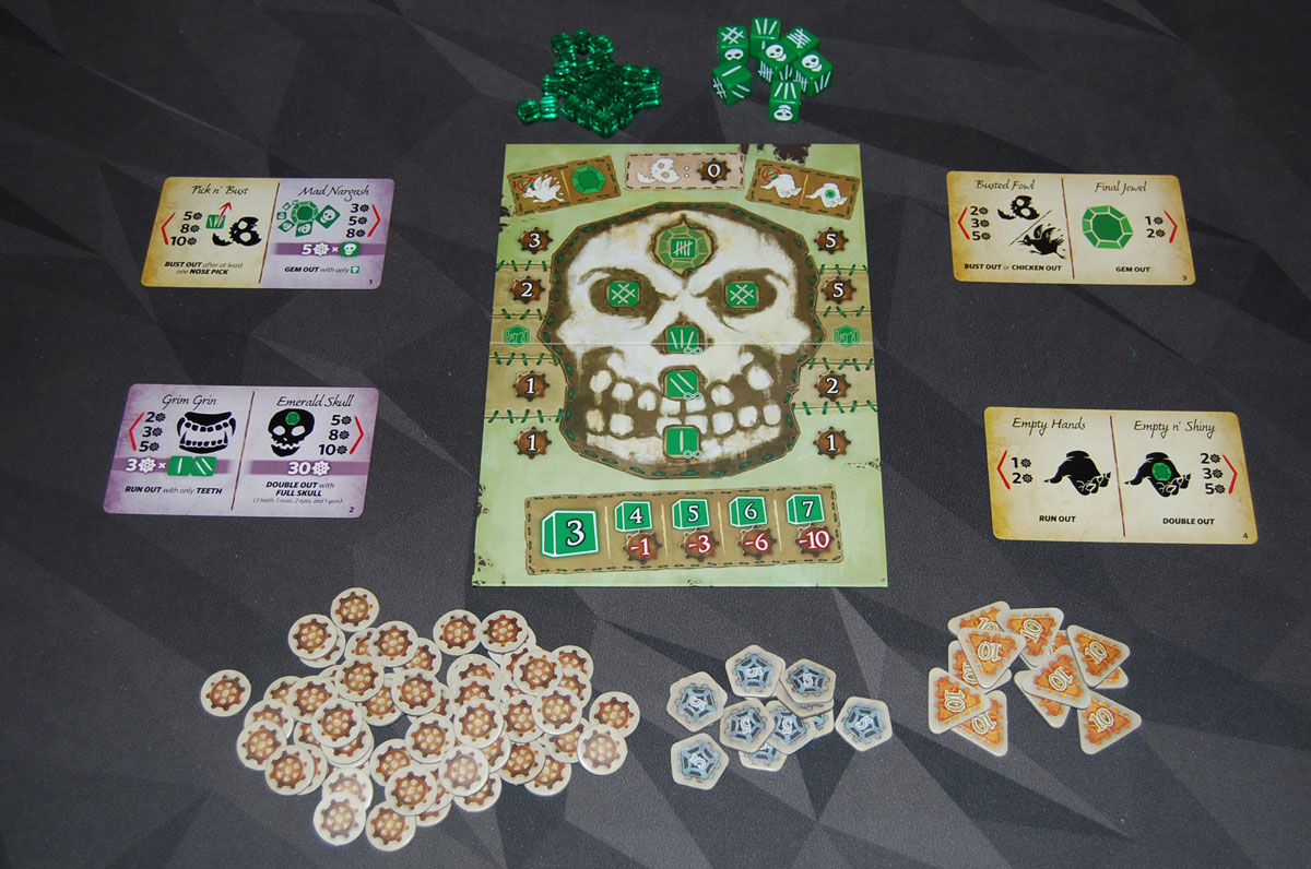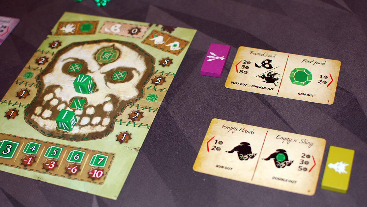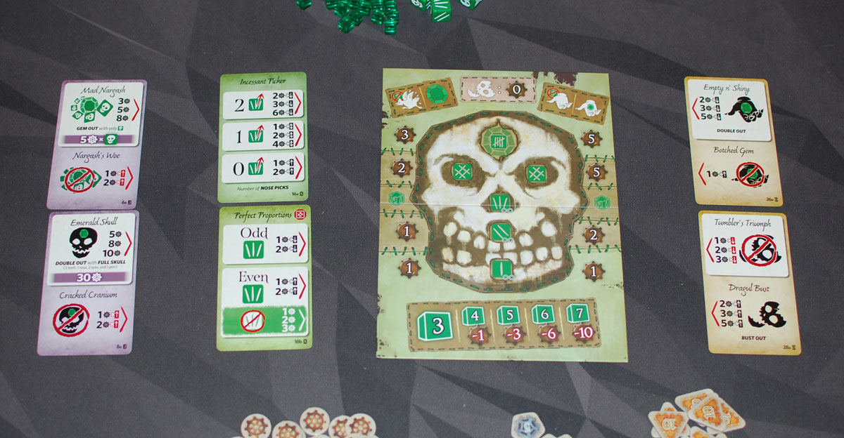 Each of these possibilities has different payouts (with Bust Out paying the Tumbler nothing), shown on the sides of the skull board. If you placed the gem, you will get paid for all of the dice, but if you didn’t, you will get paid only for the non-skull dice you placed. Higher dice values generally pay more, and the 3s give you reroll cubes.