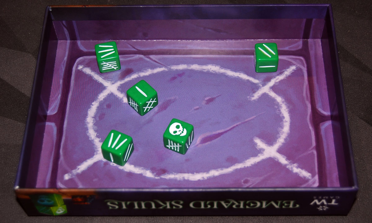 Dice rolling! Press your luck! Betting on your opponent’s downfall! Emerald Skulls has it all!