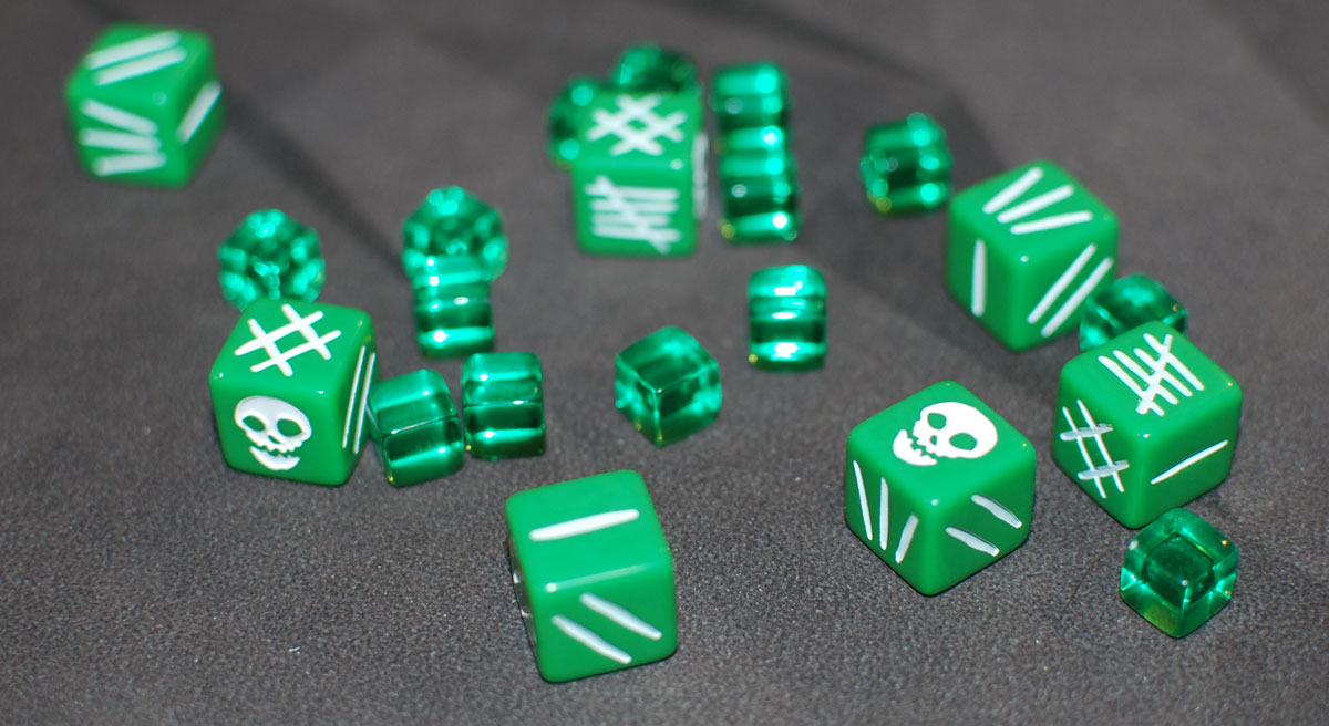 The dice are custom six-sided dice, showing stylized tally marks for the numbers 1 through 5, and a skull for the 6. The reroll cubes are small plastic green cubes: we figured they’re probably supposed to be boogers since they’re associated with the skull’s nose and the icon for them looks slimy.