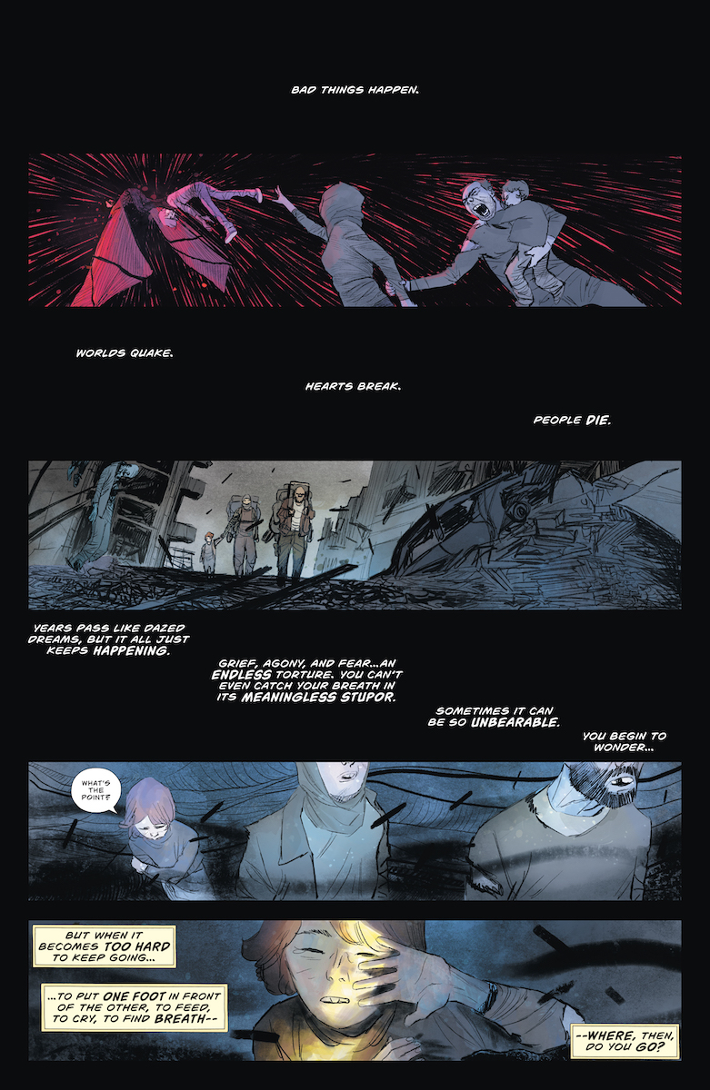 Ray: Our return to the Tangent Universe has been one of the most fascinating books out of Black Label so far, plunging us into a dark and haunted world where shades hunt the few remaining humans and the mysterious lantern-bearer known as Green Lantern is the only defense around. Most of the heroes of this world are gone, but last issue saw Green Lantern and her young companion encounter this world’s version of Batman – a cursed medieval prince now calling himself Batwraith, whose spirit pilots a mobile suit of armor. But the intro to this issue introduces the darkest threat in the series so far – a mysterious cult known only as Providence, where desperate pilgrims come for safety only to be exploited and tortured in a strange religious ritual by a sorceress known as Demona. This segment is the most horror-like of the already eerie series.
