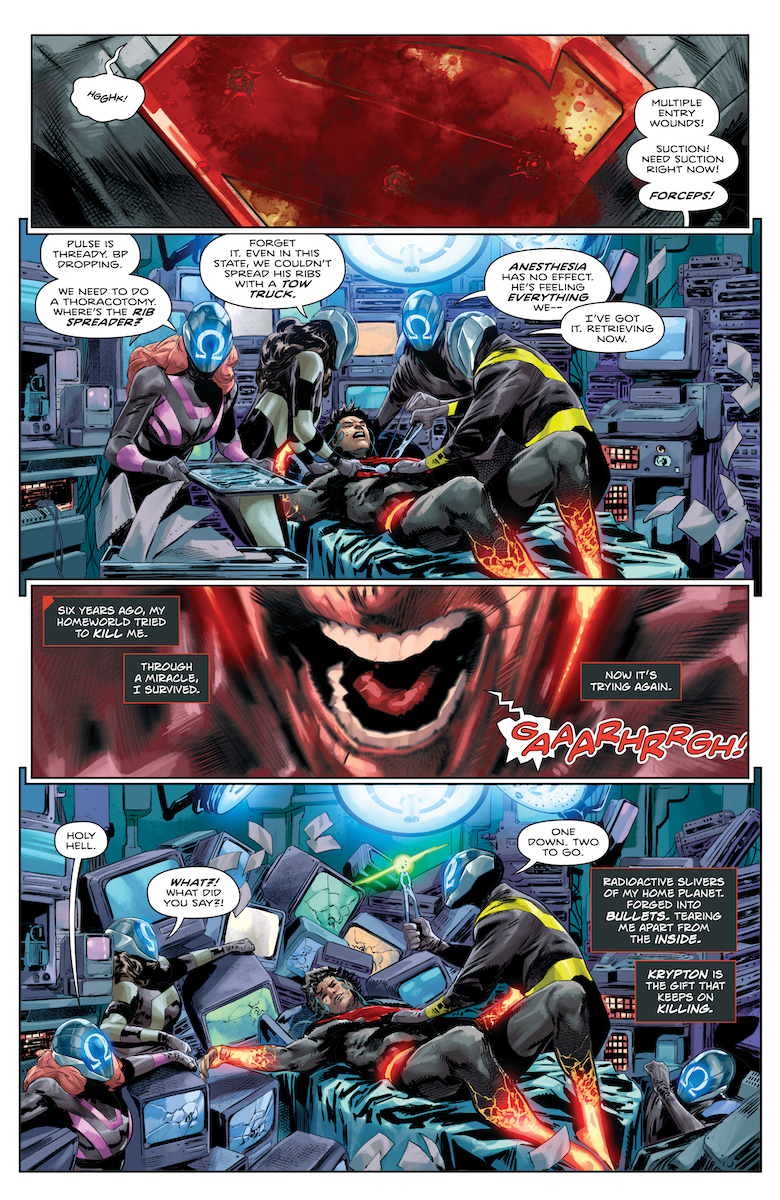 Ray: Of all the Absolute books, this one might be jacking up the tension the most with every issue. Its Superman is a haunted refugee who lacks a home or any roots on Earth, its Jimmy Olsen is an embittered rebel soldier, and its Lois Lane was a functionary of Lazarus Corp – and the powerful corporation wants her back. This series’ take on Ra’s Al Ghul, the leader of the shadowy cult-turned business, reminds me a lot more of Vandal Savage at points. He’s incredibly corrupt, wildly ambitious, and believes the whole world should see him as a God. The pressure he puts on Lois is terrifying at times, and he gives her no chance to acquiesce. But Superman has bigger concerns – like the Kryptonite bullet currently in his chest. Superman has been shot like this before, but we’ve never seen him have to perform Father-Box-Assisted surgery on himself in the middle of a highway chase.