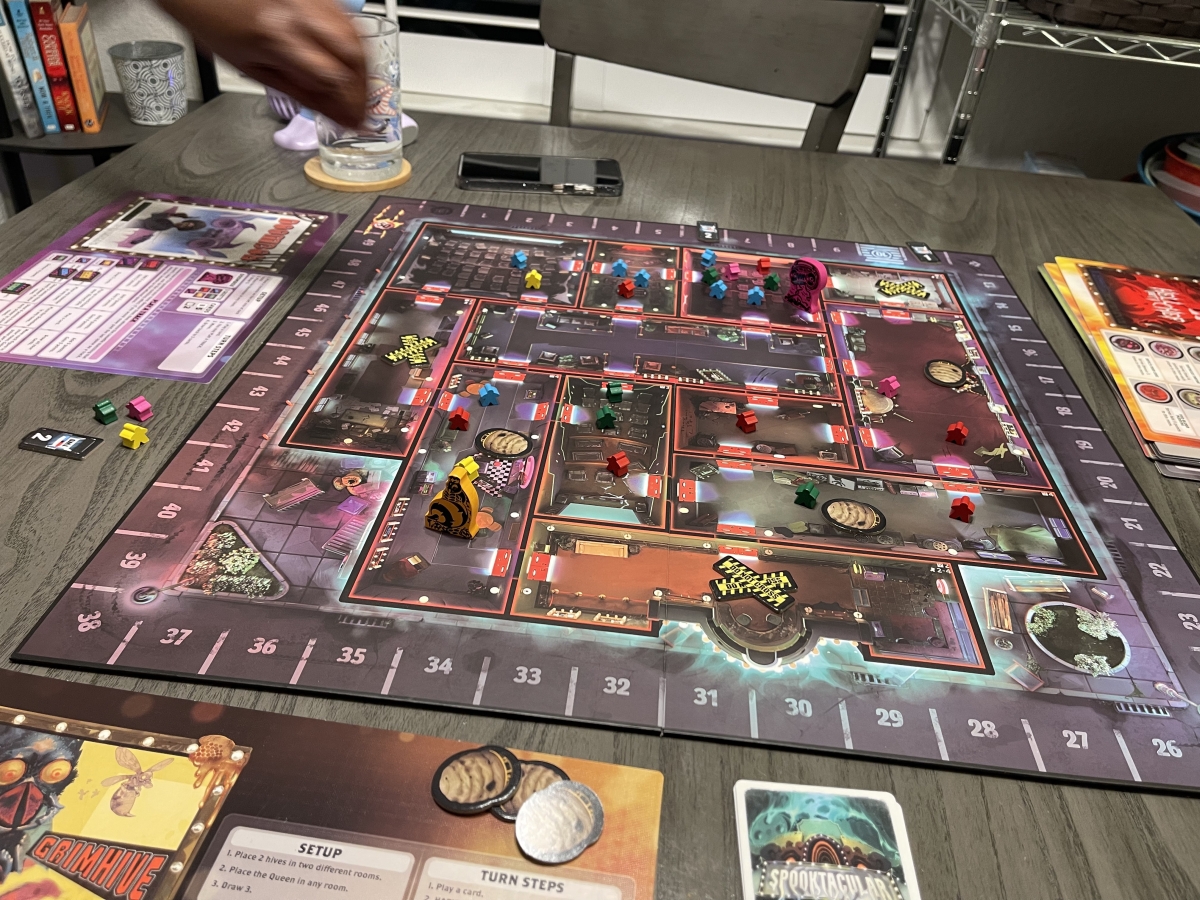 In Don’t Go In There, you’ll play as neighborhood kids exploring the many rooms in the mysterious haunted house up the street. Each room houses three cursed items and can hold up to three occupants. If you place your meeple further into the room, you’ll get a better pick of the cards, but you’re also more liable to attract ghosts from the glow-in-the-dark dice that are rolled before the room resolves. Collect the right cards and avoid having the most ghosts to leave the house with the least amount of curses and win the game! Don’t Go In There is a great spooky-but-not-scary experience for the whole family, it’s got a ton of fun push-your-luck moments, and it plays in a cool 20-30 minutes – perfect for a pre-Halloween treat! Find a copy on allplay’s website here. (AH)