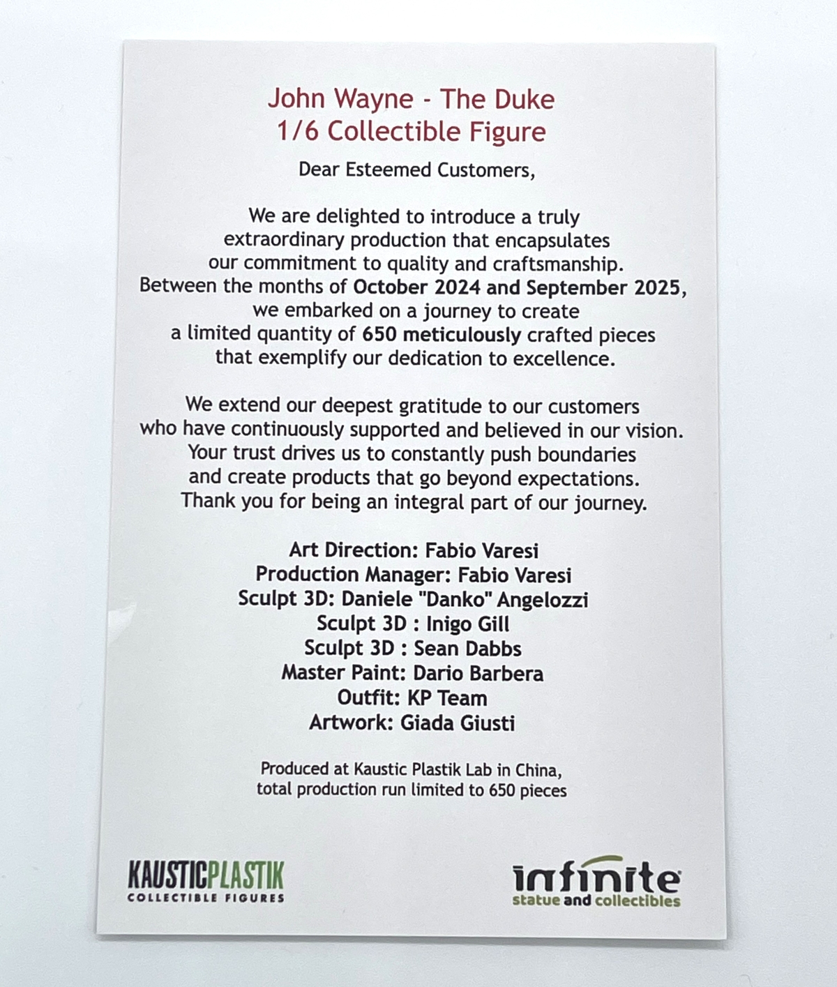 The figure was made by the Kaustic Plastik team, and you can see the credits on an included card: