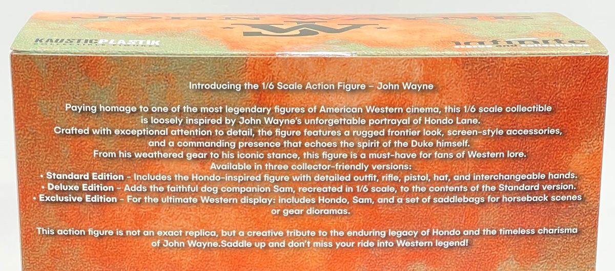 The back of the box is mostly notable for the desert scenery, as well as John Wayne’s signature and the specific edition number of the collectible.