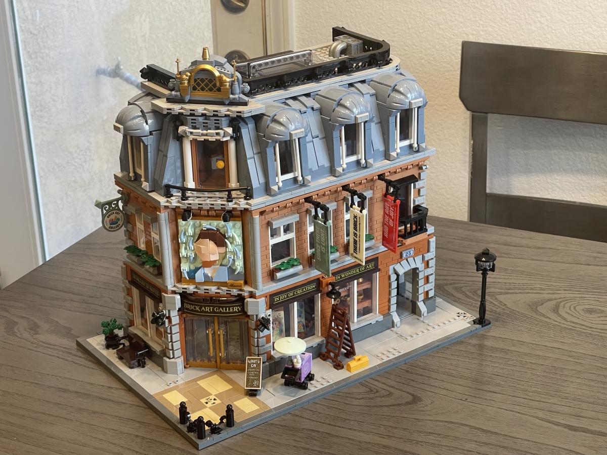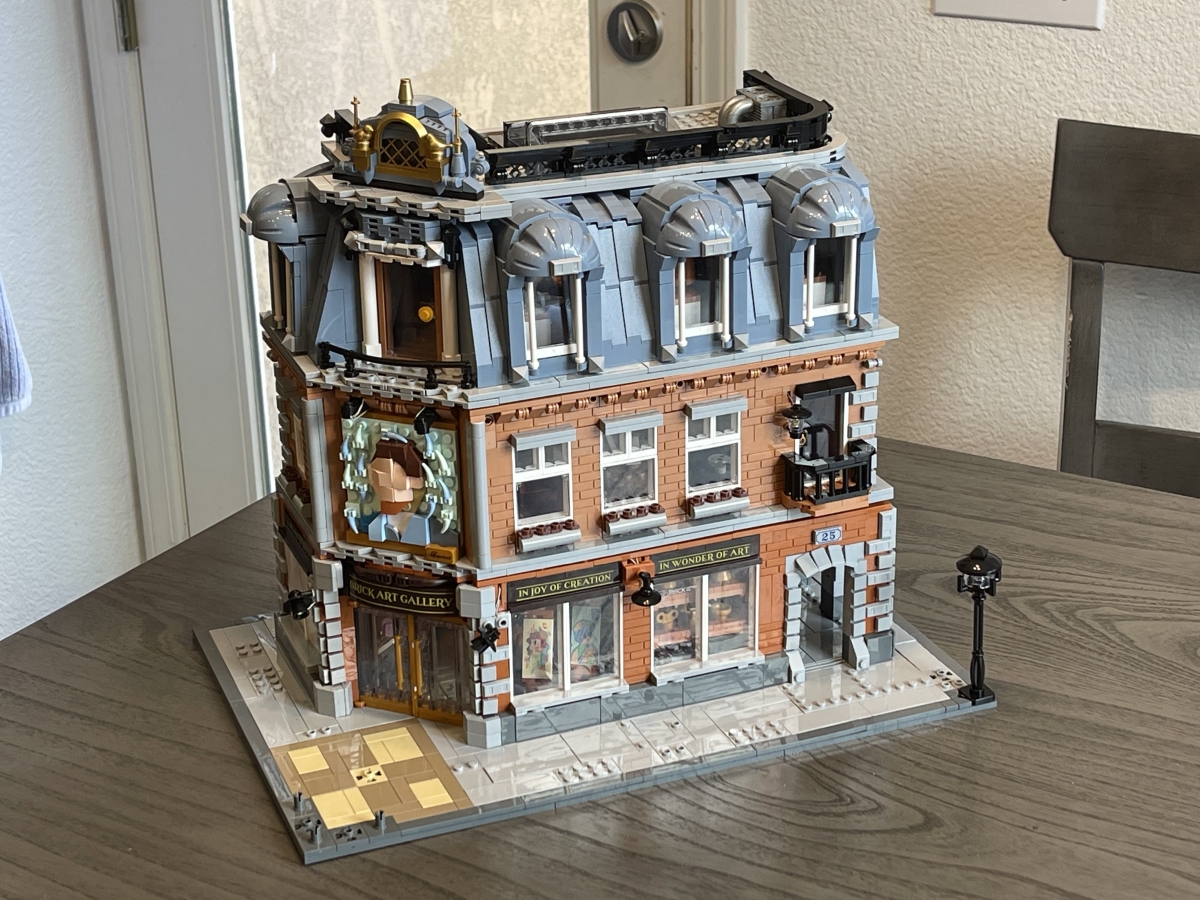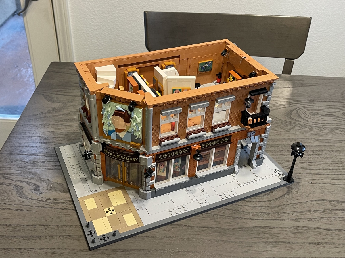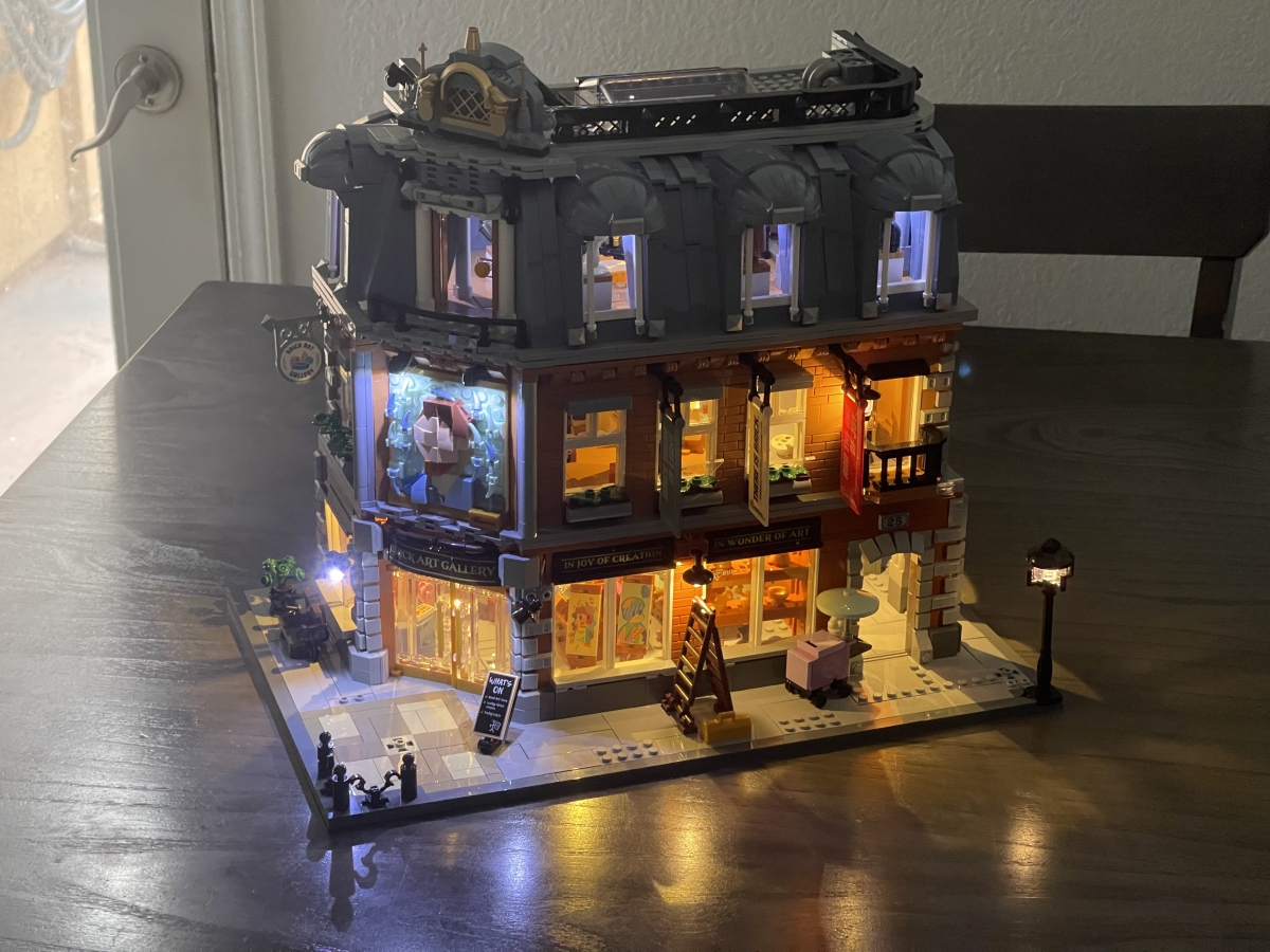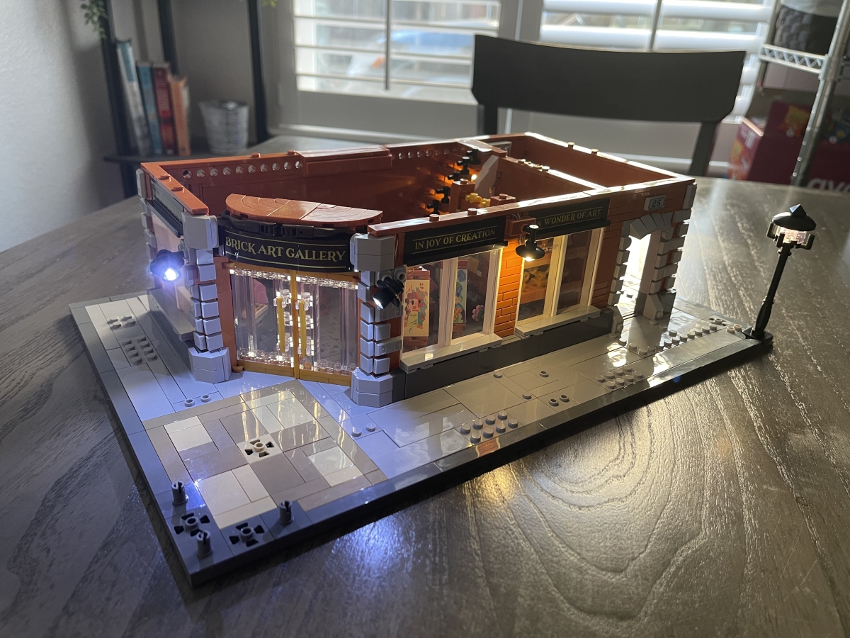 Here’s the final, decorated Brick Art Gallery, before turning on the lights: