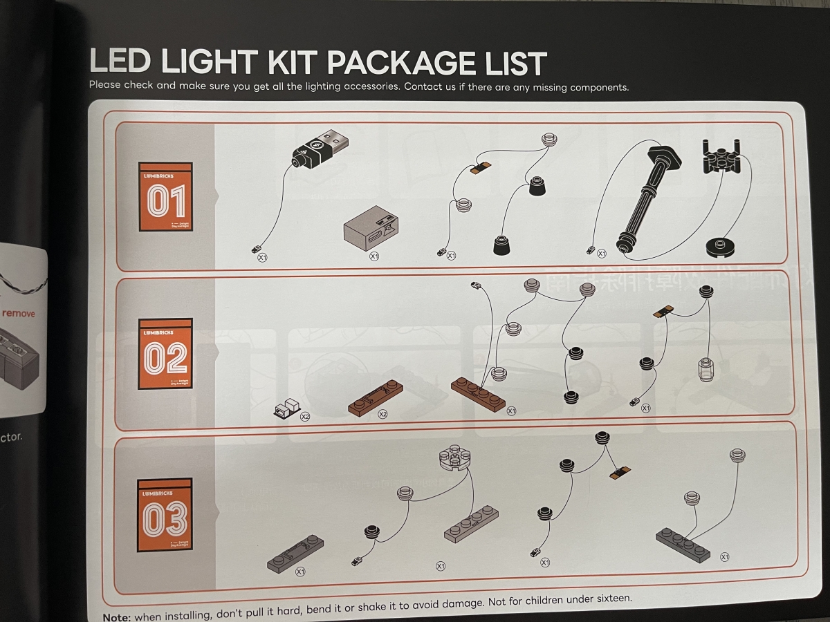 While the majority of the assembly instructions use only visuals and numbers, the first of the instruction manuals goes into details on the set and how to work with the lighting elements. These instructions are also presented in multiple languages, including English.