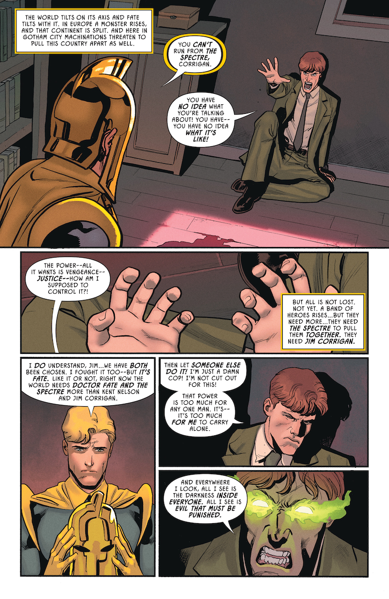 Ray: For the first three issues of this arc, the characters have all been divided. The JSA as we know it has been little more than a mirage, as duos of lone heroes struggle to unravel a much larger mystery. But now, finally, we’re starting to see the pieces come together as each hero discovers something hidden within the larger picture. Doctor Fate and Jim Corrigan, the two most powerful heroes in the group, bond over Corrigan’s fear of the power within him, with the spirit of vengeance making him see nothing but the evil in the world. Dr. Nelson, however, has a very different perspective. But not everyone is getting along – Wonder Woman and the Atom can barely stand each other, but when they encounter Hawkman and Hawkwoman, things quickly deteriorate between the two groups. It’s only when Dr. Curtis and his mysterious boss appear that they’re forced to work together – albeit briefly.