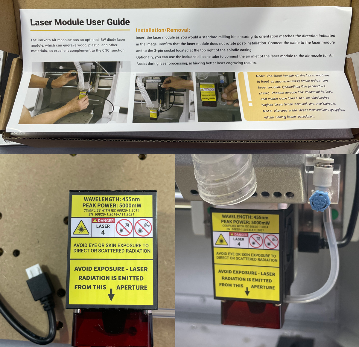 Next up, I wanted to give the laser module a test because LASERS! The laser module is as easy to install as swapping any other bit. Pull down the lever, insert the laser module, raise the lever and it’s locked in place. There is one extra step of plugging in the controller cable, but its an easy quick connect cable – easier than a USB cable for sure. There is an optional air assist for the laser to help keep certain materials from burning too fast. To use it, you’ll need an air compressor and hose that connects to the air port next to the vacuum port.