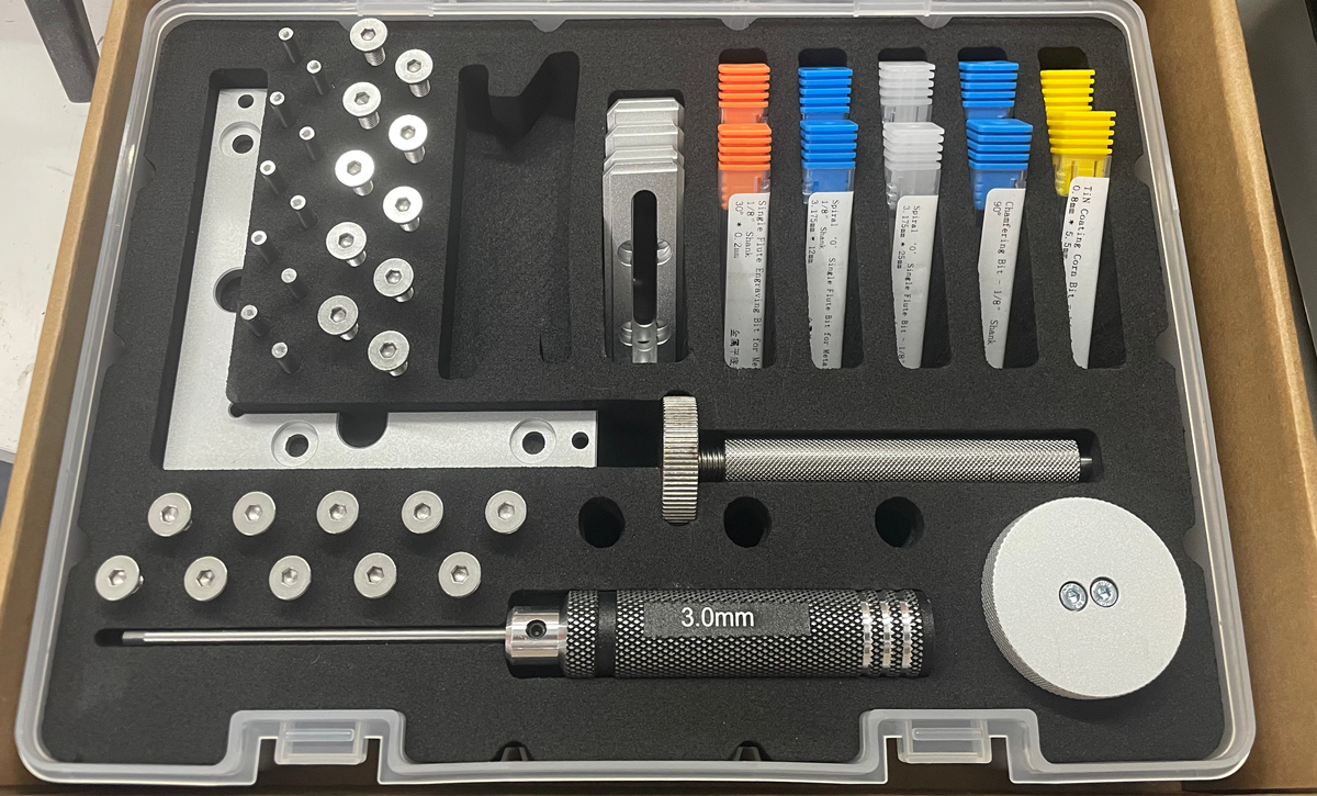 Did I mention I love storage and organization? Inside the Tools cardboard box is a plastic, latching tool box with a beautiful insert with cutouts for the hex driver, the collet tool, a variety of metal pegs and screws, the material holders, and most common bits.