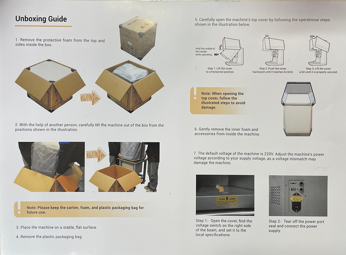 The first step was unboxing this beauty and beast. While it isn’t huge or extremely heavy (about 65 pounds and roughly 20 in x 18 in x 18 in), it’s definitely a two person job to at least get it out of the box and onto your table. Upon opening the box, the first thing you’ll see is a quick unboxing guide. This was a good indicator on how easy the machine is to setup and use and how Makera guides you the whole way.