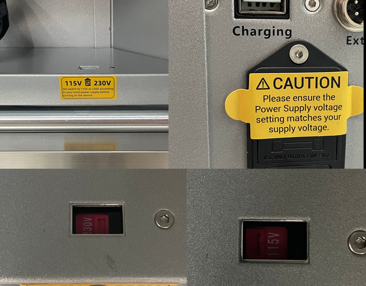 The first and most important step in setting up the Carvera Air is setting the voltage. There is a bright yellow warning on the Unboxing sheet, another inside the machine near the voltage switch, and, in the event you missed both of those, one covering the power supply plug so you can’t even try to plug in the machine without doing this crucial step (or completely ignoring it at your own peril). My machine was set to 230V by default which would not have been good, so after switching it to 115V, I was off to the rest of setup.