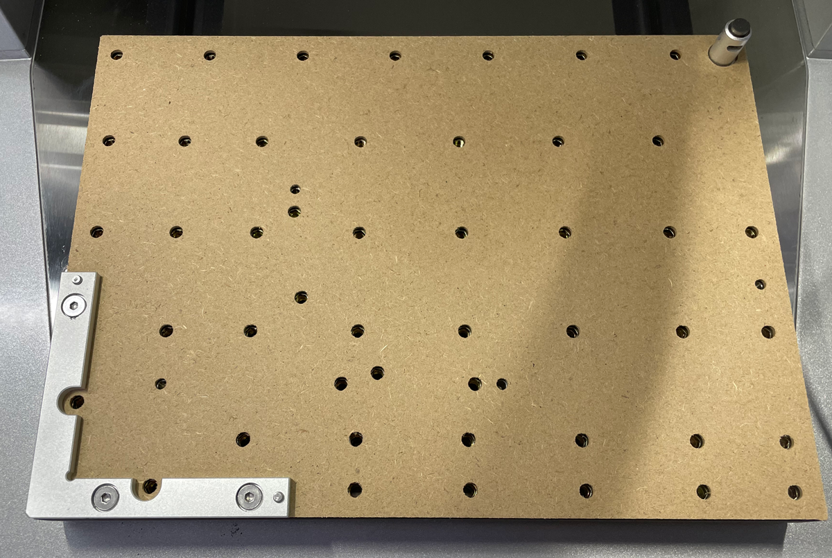 The other absolutely required setup accessory is the waste board and L-bracket. The waste board is what you’ll put your materials on, and, as its name implies, is a consumable. It is designed to take a beating and get carved into and lasered. that being said, I try to cut into it as little as possible, but it helps protect the actual bed from damage when you need to (or accidentally) cut all the way through your material by a little bit. The L-bracket is what will help hold your material in place and ensure a constant starting point that is pre-programmed into the Carvera Air software.