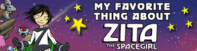 Continue ReadingZita is back! The final volume of Ben Hatke’s sci-fi graphic novel trilogy is out now: The Return of Zita the Spacegirl. To celebrate, First Second Books asked bloggers and librarians and teachers and authors to write or draw a piece called “My Favorite Thing About Zita the Spacegirl,” and I was happy to join the party.