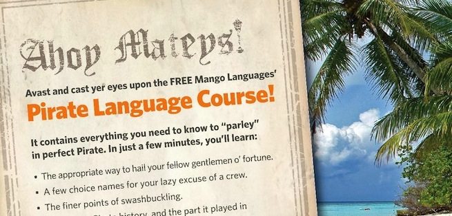 Continue ReadingIn honor of Talk Like A Pirate Day, Mango Languages has a free course in talking like a pirate. Get started to be ready for the big day!
